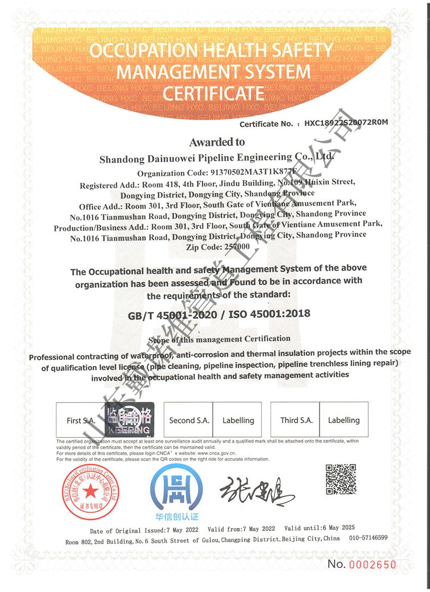 管道非開挖修復工程服務企業資質證書