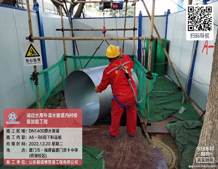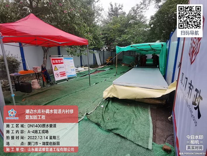 4.項目概況:湖邊水庫DN1400補調水管道全長8709.5m,起點為高殿水廠。湖邊水庫補調水管道設計輸水能力20萬m3/d,是保障廈門市島內原水應急供應的重要管道。湖邊水庫補調水管道補調水管道自2010年1月投入運行,部分路段管道多次發生漏水或破管事件,因此本次對爆管頻繁發生段管道予以修復。該現狀管管徑為DN1400,采用預應力II 級鋼筋混凝土管(以下簡稱混凝土管)、鋼管和球墨鑄鐵管埋地鋪設,其中原管材為鋼管或球墨鑄鐵的管段本次不予以修復。由于混凝土管段多次發生管道破裂、脫節及沉降事件,因此本次對混凝土管段予以修復,全長3568.55m。采用非開挖方式內襯不銹鋼更新修復。